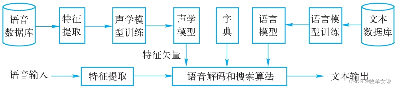 语音识别就是把一段语音信号转换成对应的文本信息,这一过程包括四个大的模块,分别是:特征提取、声学模型、语言模型、字典与解码。