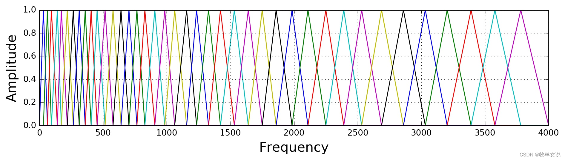 该步是通过定义M个三角滤波器组,对上一步得到的功率谱进行滤波。M的取值范围一般在22~40,标准值为26,这里取40。滤波器组中的每个滤波器都是三角形的,中心频率为f(m),该处响应为1,中心频率两边线性减小到0。各f(m)之间的间隔随着m值的增大而变宽,如下图所示: