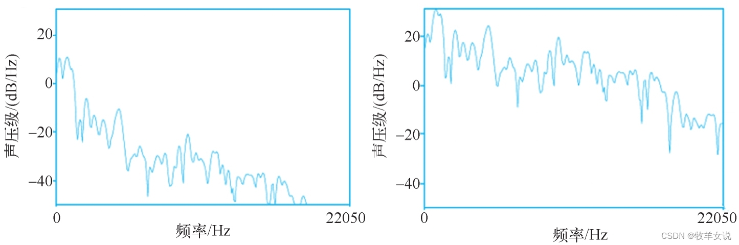 预加重的实现方法:给定时域输入信号x,预加重之后的信号y为:y(t)=x(t)−αx(t−1),其中0.9≤α≤1.0。经过预加重之后的频谱图和原始的频谱图的比较如下图所示,其中,左侧为原始频谱图,右侧为预加重处理之后的频谱图。