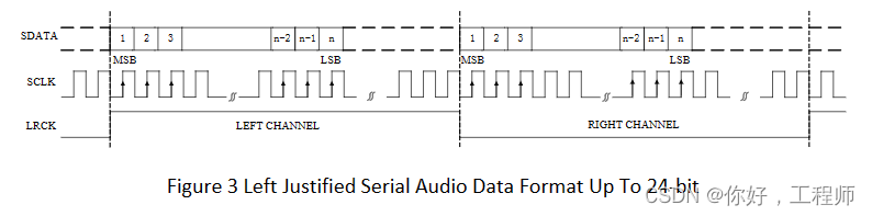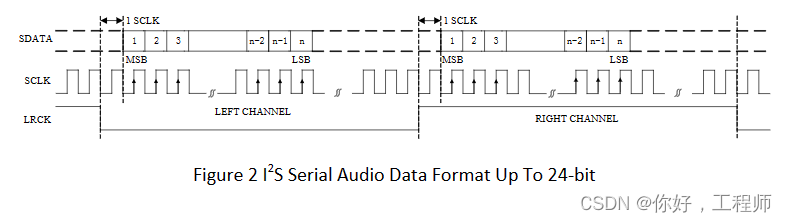 I2S格式:I2S格式的信号无论有多少位有效数据,数据的最高位总是出现在LRCK变化(也就是一帧开始)后的第2个SCLK脉冲处。