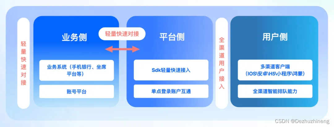 【得助音视频平台】提供轻量级平台SDK,支持全渠道(iOS、安卓、H5、小程序、鸿蒙)客户端服务接入需求,可快速对接企业业务系统及账号平台,并具备全渠道智能排队能力。