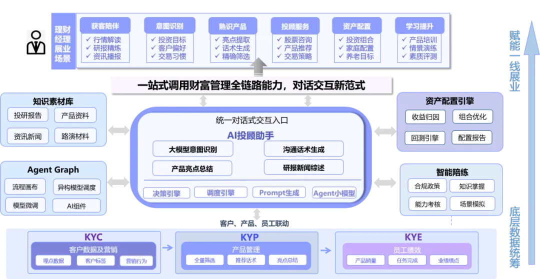 在与头部财富管理机构共创的过程中,中关村科金基于真实业务痛点,创新打造了大模型应用投顾助手。以大模型为智能基座,调度机构内现有的客户、产品、资讯、投研、资产配置等系统,以企业微信作为统一入口,通过对话的交互方式,辅助理财经理深入确认KYC、掌握产品知识、提供投顾服务、持仓跟踪分析、日常内容陪伴等,覆盖展业的方方面面。