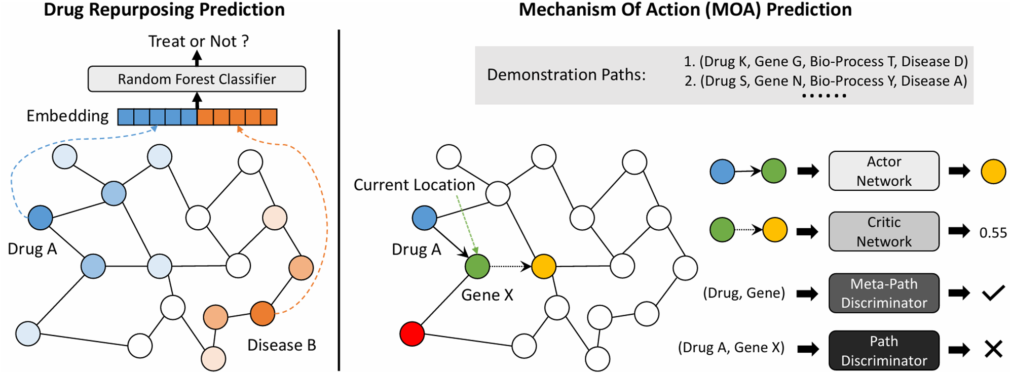 阅读大量的文献后,我找到了一个不错的方法——KGML-xDTD:一种基于知识图谱的机器学习框架,用于可解释地预测治疗疾病的药物。它有两个模块,第一个模块可以预测某种药物治疗某种疾病的概率,第二个模块可以通过知识图谱的路径从生物学上解释该药物的作用机制。它可以有效减少“黑箱”问题,进一步加速新兴疾病药物研发的进程。