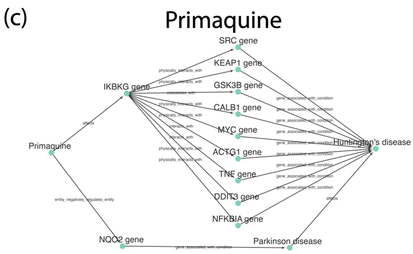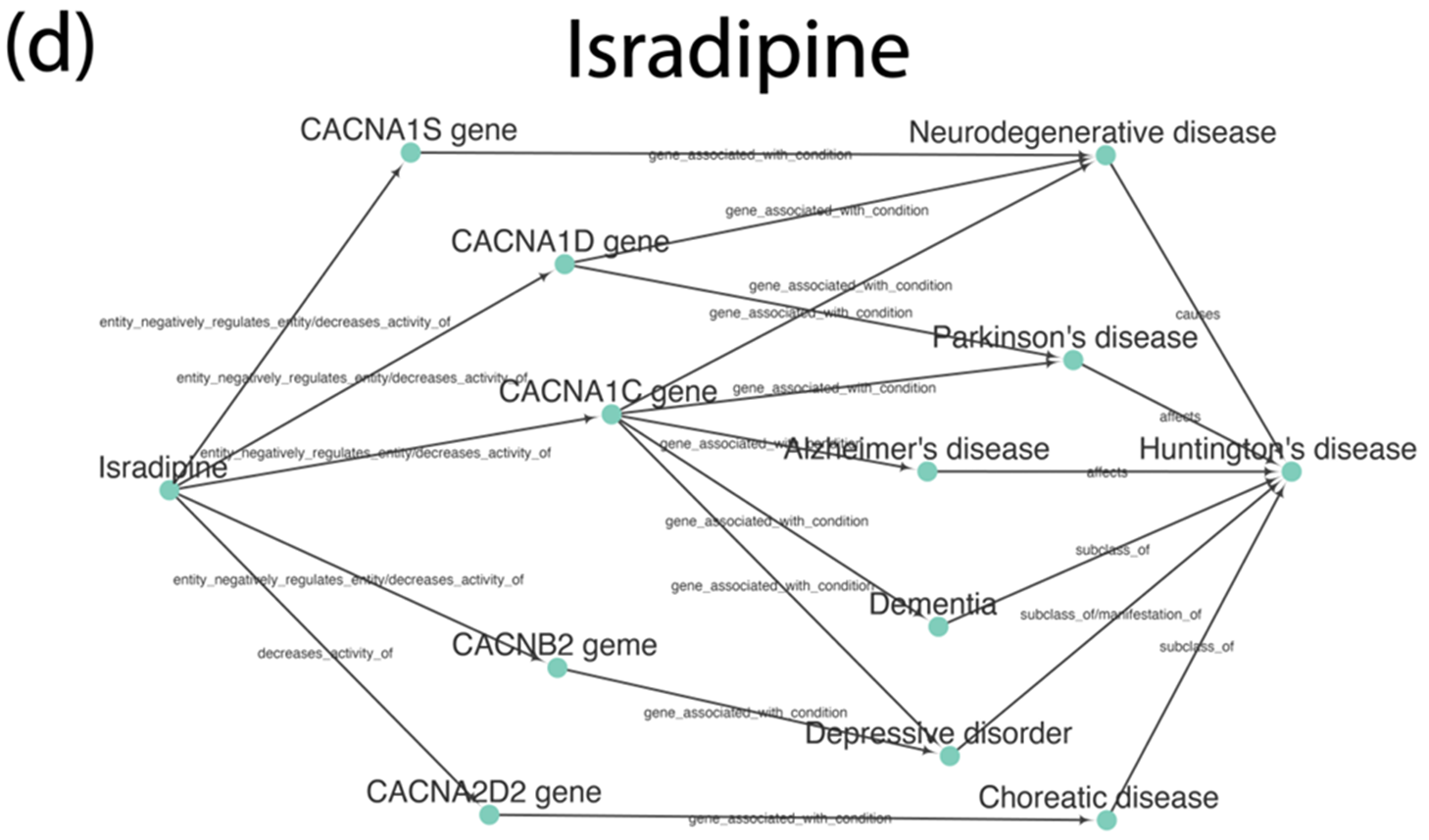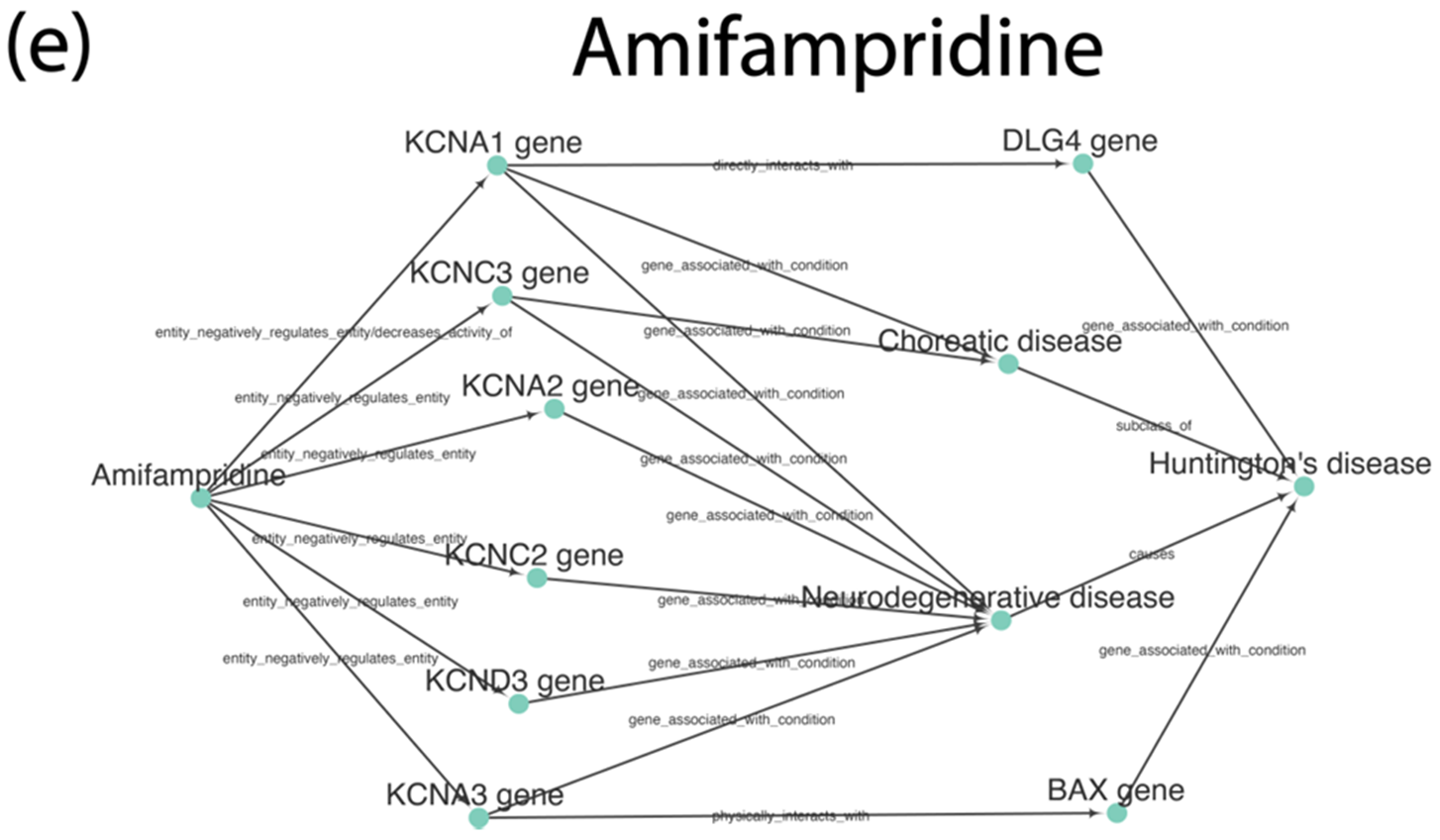 子图(e)显示,阿米吡啶调节钾电压门控通道的基因来治疗HD。所有这些例子表明,预测的BKG-based 作用机制路径在一定程度上可以解释药物再利用的机制。