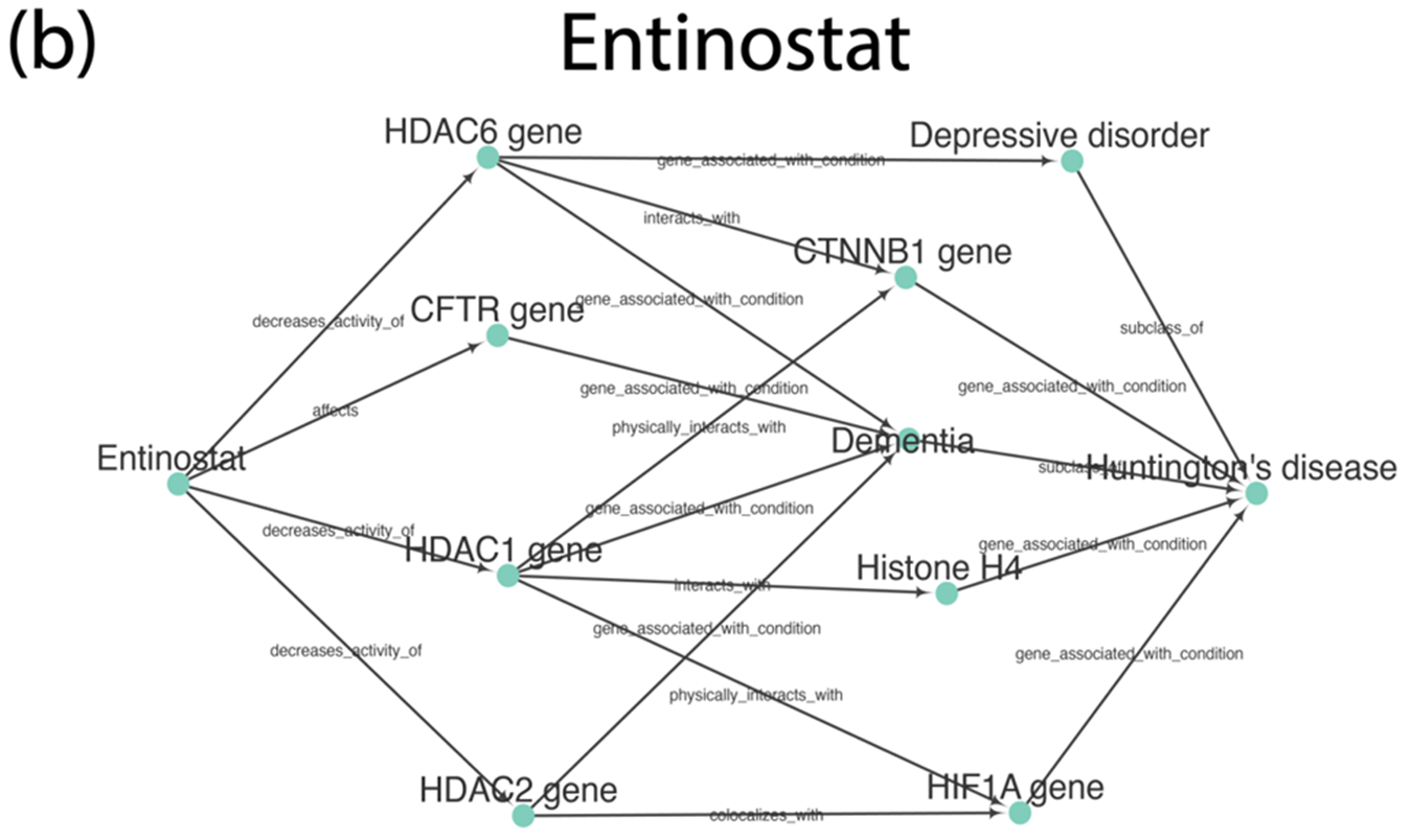 子图(b)显示,恩替司他通过抑制组蛋白去乙酰化酶基因(如HDAC1、HDAC2、HDAC6)的功能来缓解HD症状,其中一条预测路径(“Entinostat” -> “减少活性” -> “HDAC1基因” -> “与” -> “组蛋白H4” -> “与条件相关的基因” -> “HD”)得到了先前研究的支持。