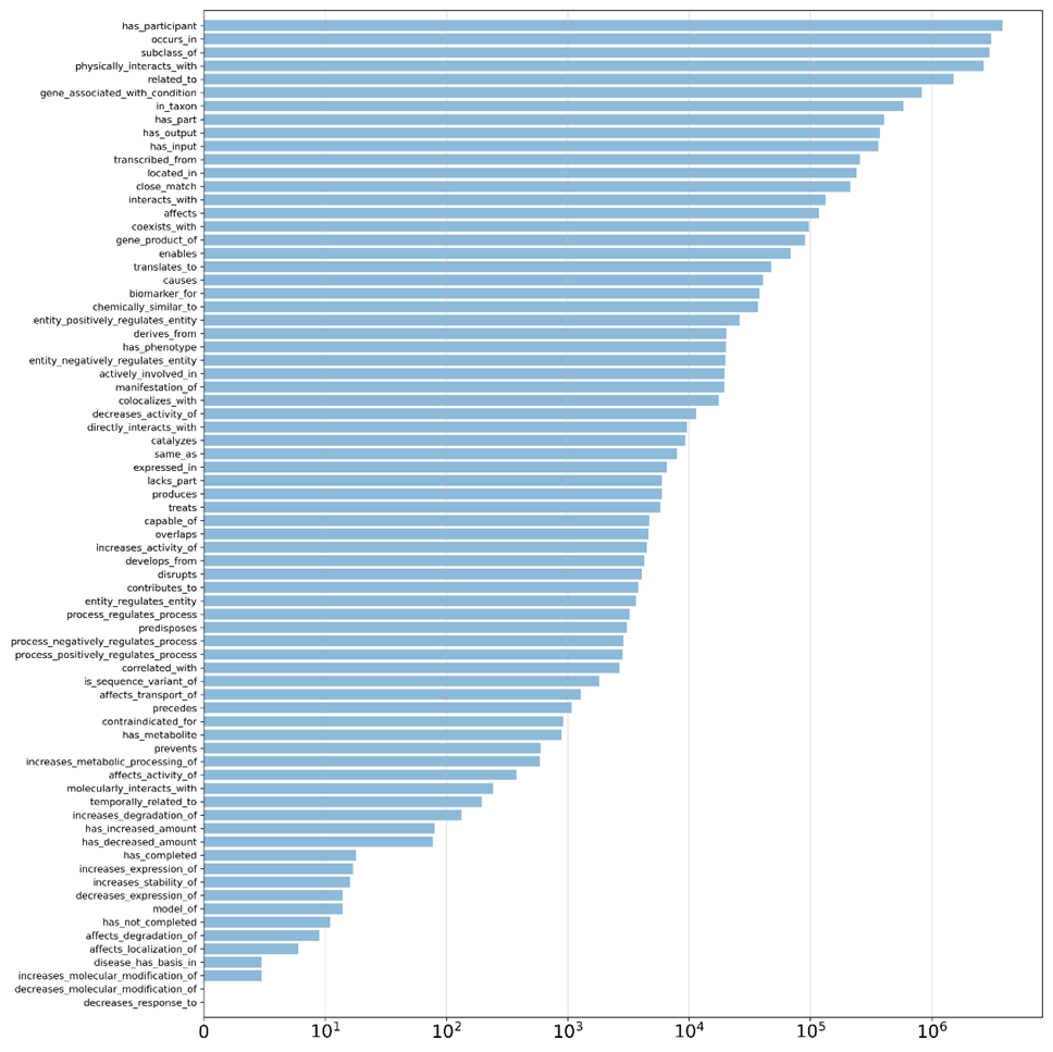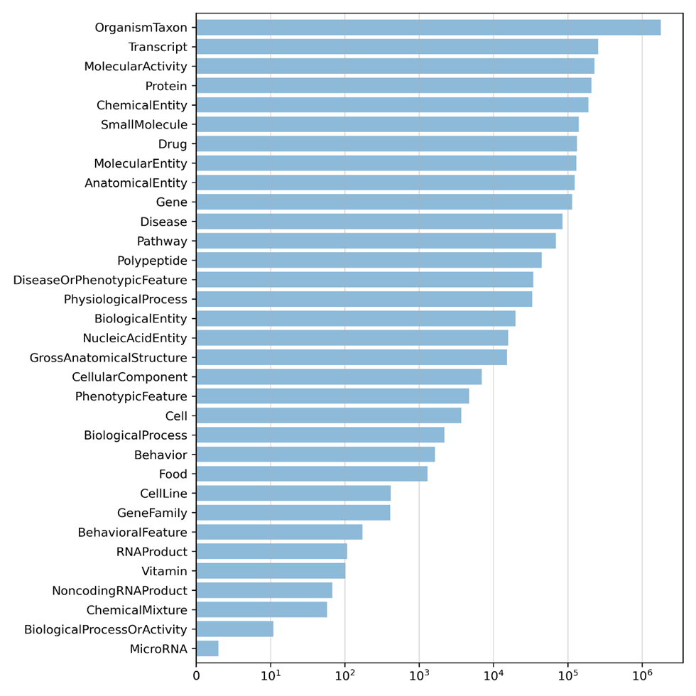 首先是数据准备。随着生物医学数据库的可用性不断提高,将数据整合到生物医学知识图谱(Biomedical Knowledge Graph) 用于药物发现的做法近年变得流行起来。本方法采用的BKG是RTX-KG2c(the canonicalized version of the Reasoning Tool X Knowledge Graph 2),它是最大的开源BKG之一,包含约640万个节点和3930万条边,整合了约70个公共生物医学数据源,其中所有生物学概念(例如“布洛芬”)都表示为顶点,所有谓词概念(例如“布洛芬 - 增加 - GP1BA 基因的活性”)都表示为边。经过数据清洗后,剩下3659165个节点(33 个不同类别,如图)和18291237条边(74个不同类别)。除了RTX-KG2c,作者还用其他人工制作的数据和NLP衍生的数据集扩展BKG数据。