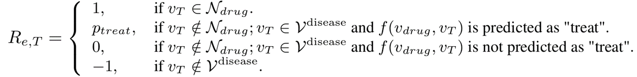 强化学习模型采用对抗性演员-评论家(Adversarial Actor-Critic)模型,其奖励如公式所示。从药A结点开始,不断移动,最终会停留到某一个结点——反复重复这个过程。如果最终停留到疾病B,则奖励为1;如果停留到某个疾病结点,且被药物再利用预测模块归为“治疗”类,则奖励为该模块给出的治疗概率ptreat,证明该路径的起始药物可以治疗一些潜在疾病,但还没有被人们发现;如果停留到某个疾病结点,且被药物再利用预测模块归为“非治疗”类,则奖励为0;如果最终留到某个和疾病无关的结点,则奖励为-1,代表错误决策。