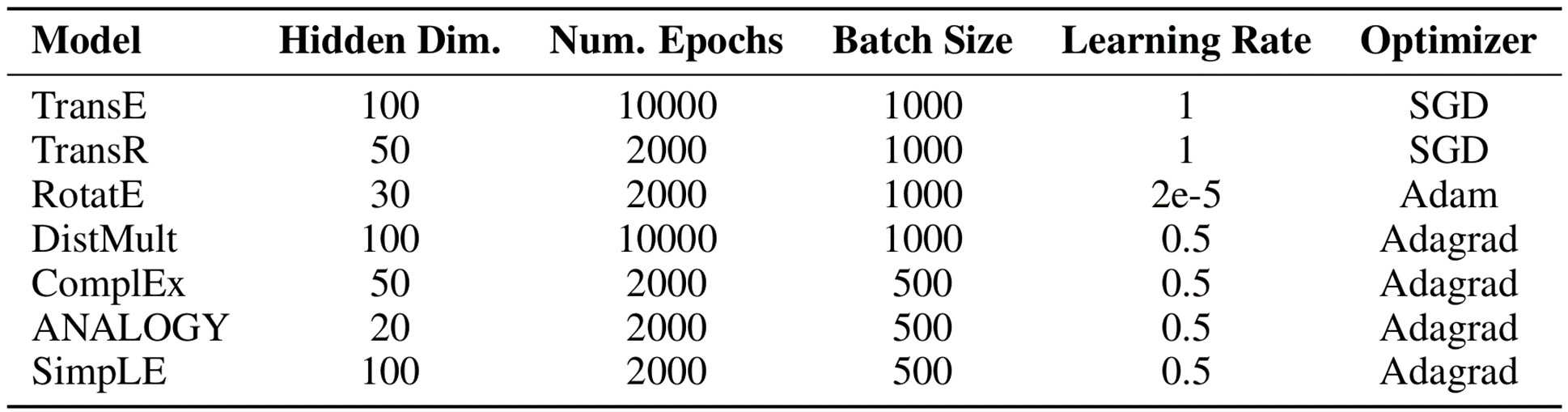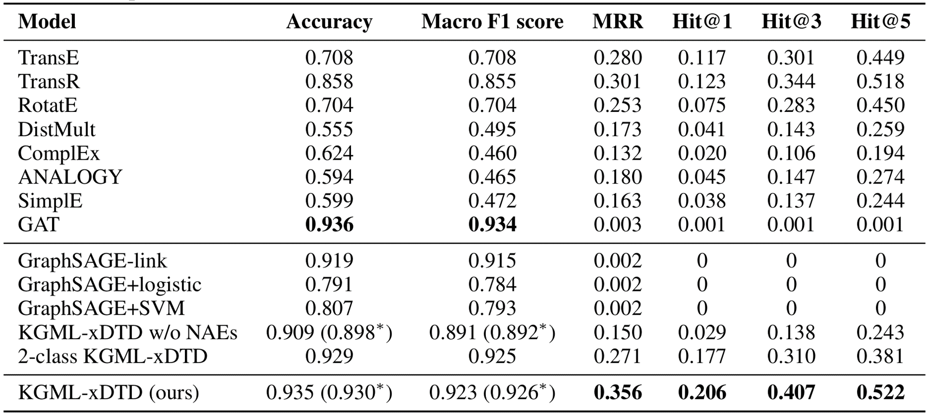 作者采用基于分类准确性的指标——Accuracy、Macro F1 score与基于排序的指标——平均倒数排名(Mean Reciprocal Rank,计算第一个相关答案的倒数排名,MRR越高,表示真实正样本在排序中越靠前)和前K名排名比例(Hit@K,计算真实正样本出现在前K个预测中的比例,Hit@K越高代表预测越准确)。
