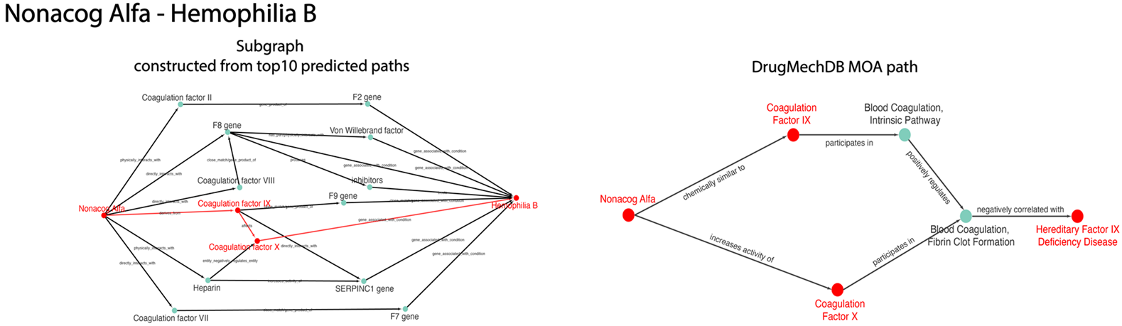 作为Ground Truth的DrugMechDB仅提供了Eptacog Alfa和Nonacog Alfa这两种治疗血友病B的药物作用机制路径,如图右半部分所示;作者使用它们与KGML-xDTD给出的前10条BKG路径解释路径进行比较,如图左半部分所示,两者相对应的生物学实体用红色高亮显示: