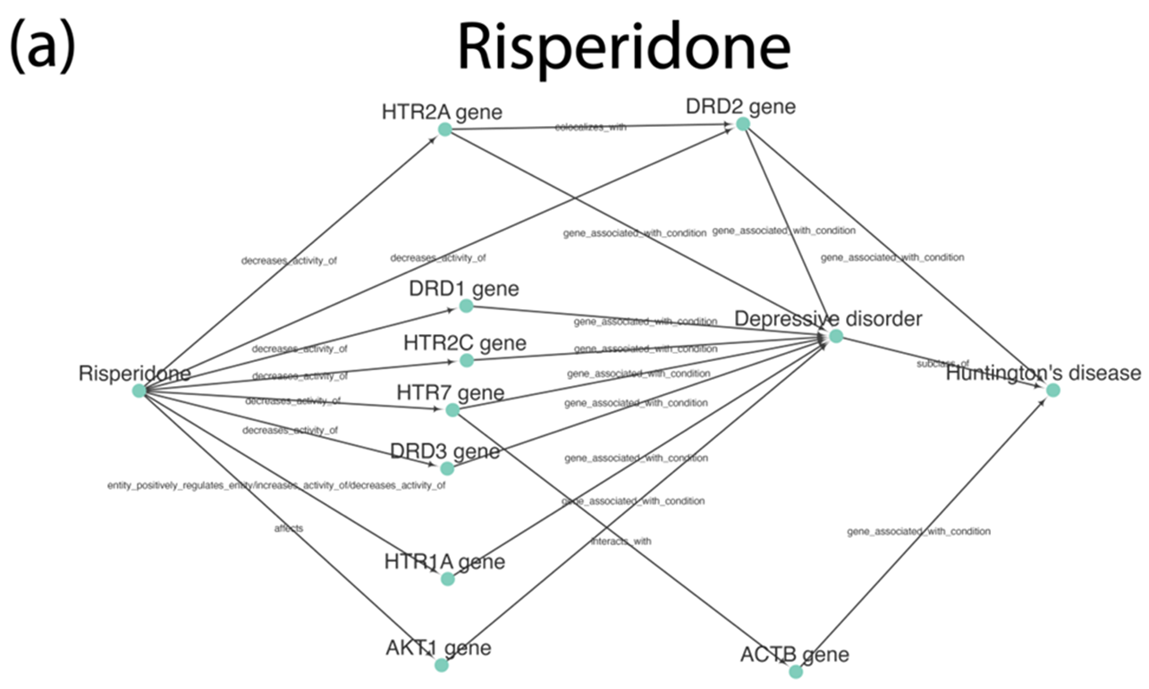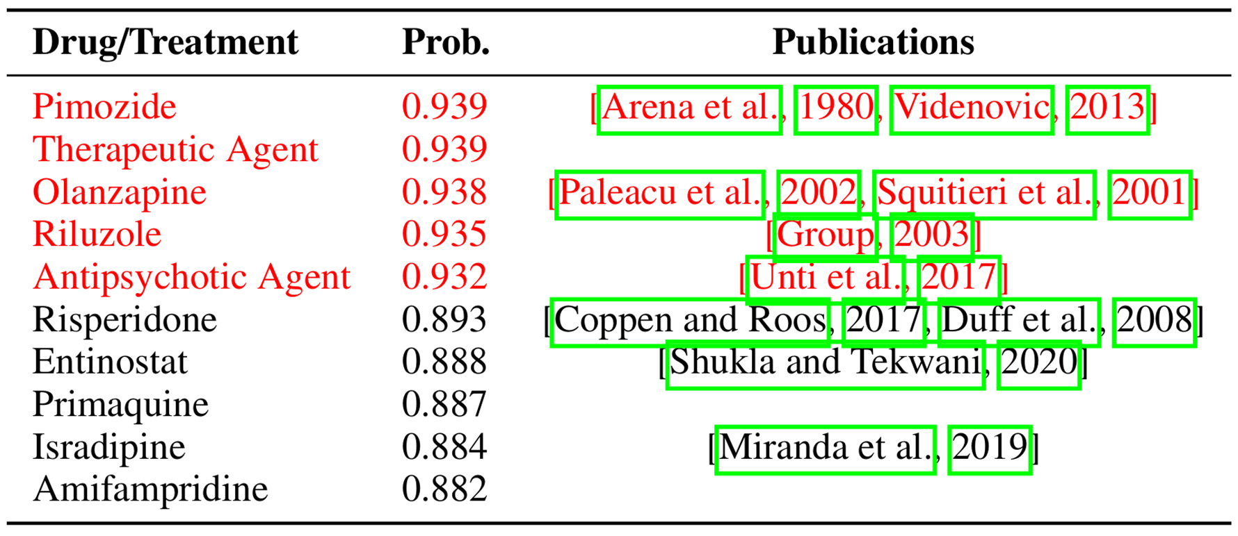 亨廷顿病是一种罕见的神经遗传性疾病,通常发生在中年,表现为抑郁症、异常运动(例如舞蹈症)和认知衰退,目前尚无药物或治疗方法能够改变HD的进程,但一些可缓解HD的症状。该表为通过KGML-xDTD模型预测的前十种亨廷顿病药物/治疗方法: