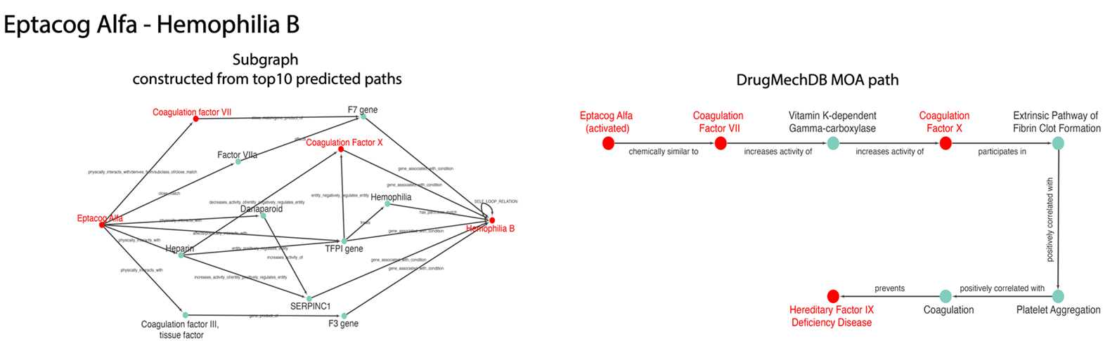 由于路径长度的限制以及自定义BKG中缺失某些语义关系,预测路径无法完全与DrugMechDB的路径匹配,但在预测的前10个路径的子图中,仍然可以找到对治疗血友病B至关重要的生物学实体(如factor VII, factor IX, and factor X)。