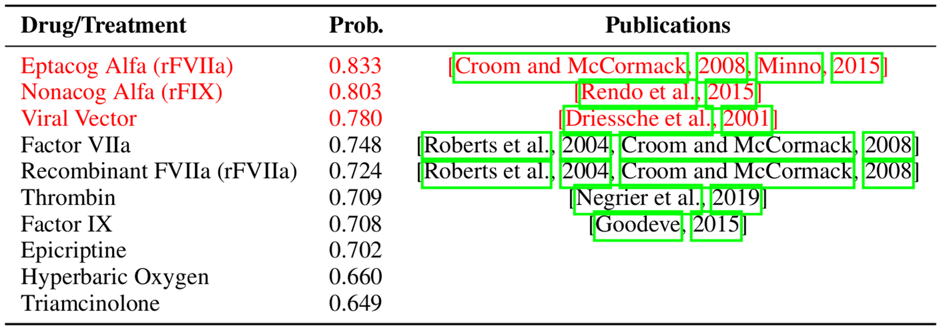 血友病B也被称为IX因子缺乏症或圣诞病,是一种罕见的遗传性疾病,患者容易发生持续性出血。它是由位于X染色体上的IX因子(F9)基因的突变引起的。该表列出了由KGML-xDTD模型预测的前十种药物/治疗方法,包括在训练集中使用的药物(用红色标出)和未在训练集中使用的药物:除了训练集中已知的药物/治疗方法外,列表中剩下的七种药物/治疗方法大部分得到了已发布的研究支持,并有潜力用于治疗血友病B。例如,活化的人源性凝血因子VII(Factor VIIa)和重组活化因子VII(rFVIIa)是促进血液凝固的关键蛋白,凝血酶(Thrombin)是维持正常止血功能的关键酶,
