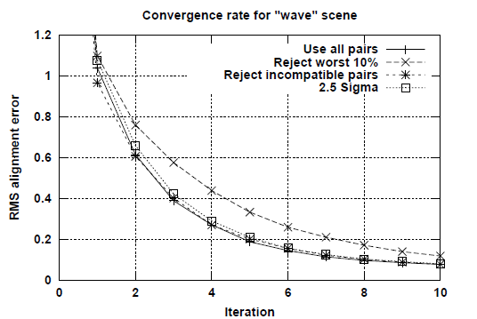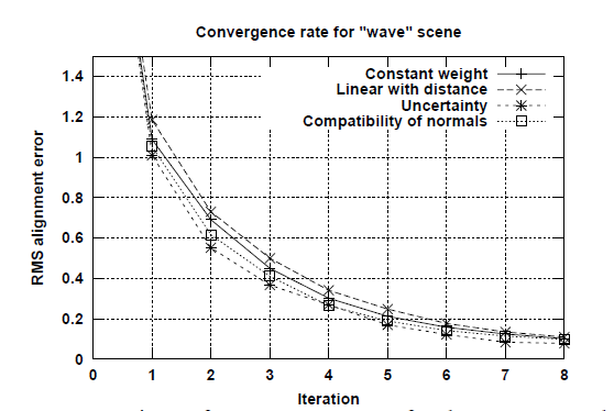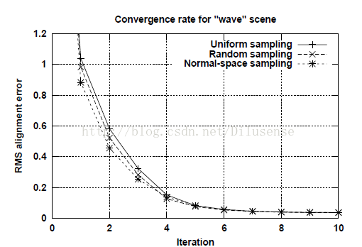 对于wave场景,由于不同点的法向分布很均匀,所以不同的取样方式收敛速度差别不大。而对于incised plane场景,由于不同点的法向差别很大,所以normal space sampling可以尽可能多的选择不同法向的关联点,具有最快的收敛速度,且注册误差最小。