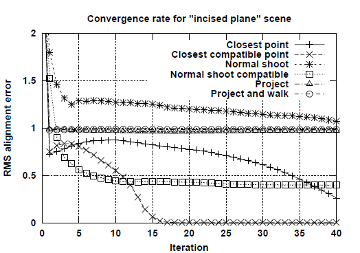对于fractal测试场景,由于closet point方法对与噪声敏感,所以收敛速度最慢,而收敛最快的方法是normal shooting方法。但是对于incised plane场景,只有closet point方法最终收敛到正确答案。有次可以得到结论closet point方法不是收敛最快的,但却是最鲁棒的匹配方法。