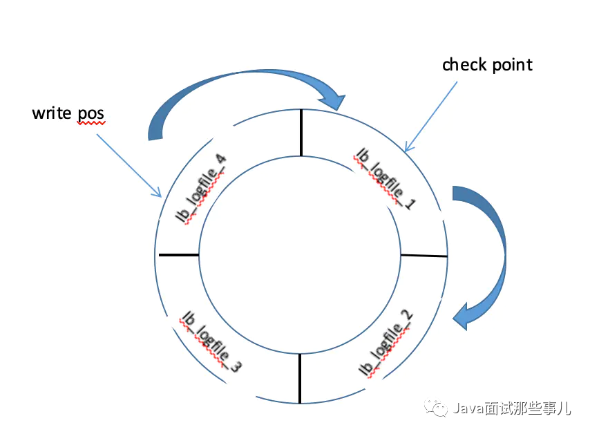 write pos表示日志当前记录的位置,当ib_logfile_4写满后,会从ib_logfile_1从头开始记录;check point表示将日志记录的修改写进磁盘,完成数据落盘,数据落盘后checkpoint会将日志上的相关记录擦除掉,即write pos->checkpoint之间的部分是redo log空着的部分,用于记录新的记录,checkpoint->write pos之间是redo log待落盘的数据修改记录。关注公众号Java面试那些事儿,回复关键字面试,领取大厂最新面试题。当writepos追上checkpoint时,得先停下记录,先推动checkpoint向前移动,空出位置记录新的日志。