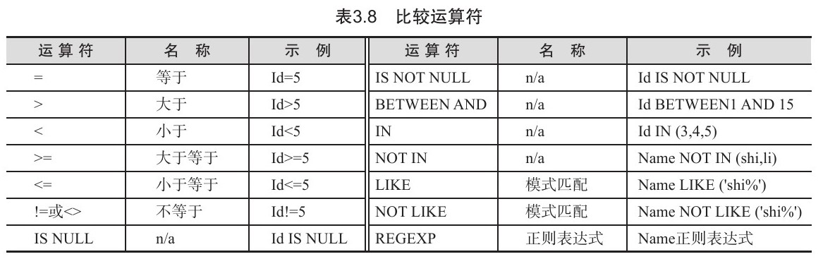 比较运算符:包括大于、小于、等于或者不等于,等等。主要用于数值的比较、字符串的匹配等方面。例如:LIKE、IN、BETWEEN AND和ISNULL等都是比较运算符,还包括正则表达式的REGEXP也是比较运算符。