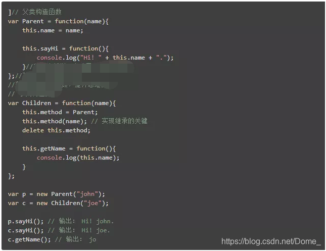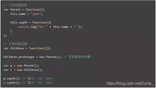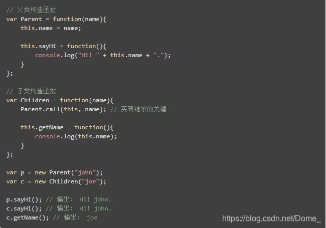 其原理如下:构造函数使用 this 关键字给所有属性和方法赋值(即采用类声明的构造函数方式)。因为构造函数只是一个函数,所以可使 Parent 构造函数 成为 Children 的方法,然后调用它。Children 就会收到 Parent 的构造函数中定义的属性和方法。例如,用下面的方式定义 Parent 和 Children: