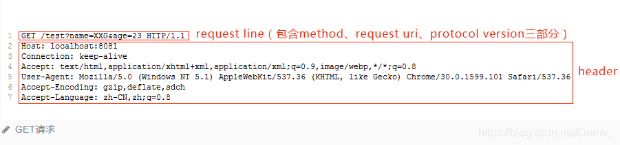 下面是浏览器对http://localhost:8081/test?name=XXG&age=23的GET请求时发送给服务器的数据:
