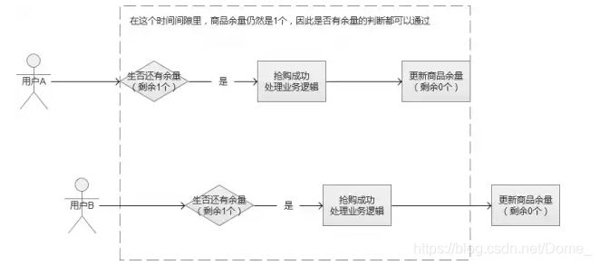 在上面的这个图中,就导致了并发用户B也“抢购成功”,多让一个人获得了商品。这种场景,在高并发的情况下非常容易出现。