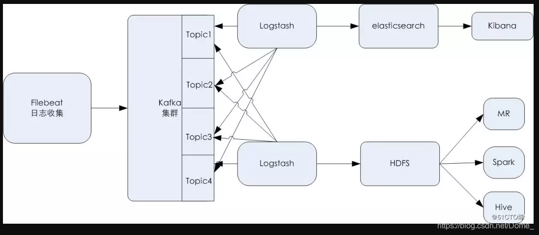 此架构的优点是搭建简单,易于上手。缺点是Logstash消耗系统资源比较大,运行时占用CPU和内存资源较高。另外,由于没有消息队列缓存,可能存在数据丢失的风险。此架构建议供初学者或数据量小的环境使用。