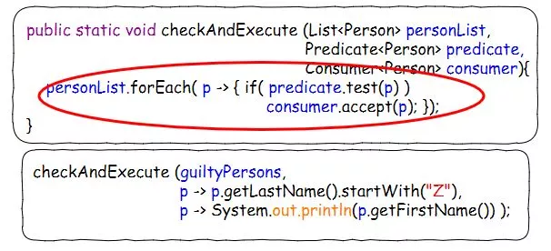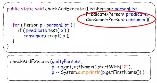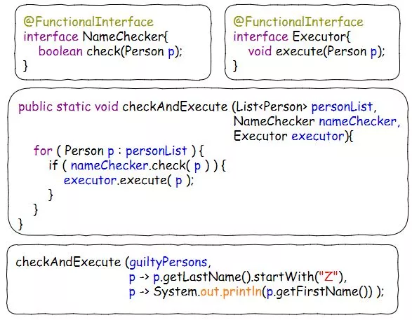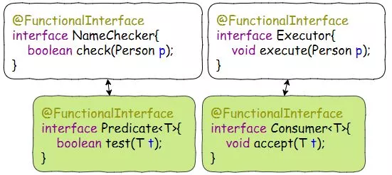 所以,我们在这里压根都不需要定义NameChecker和Executor这两个函数式接口,直接用Java 8函数式接口包里的Predicate<T>和Consumer<T>就可以了——因为他们这一对的接口定义和NameChecker/Executor其实是一样的。