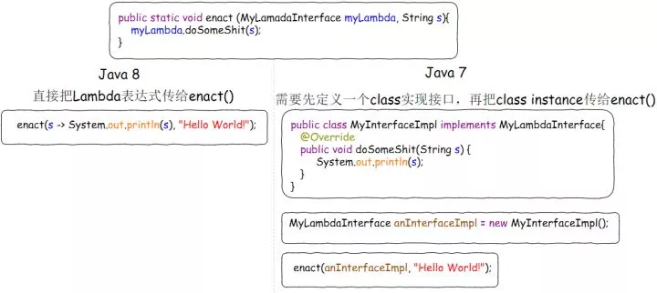 这两种写法本质上是等价的。但是显然,Java 8中的写法更加优雅简洁。并且,由于Lambda可以直接赋值给一个变量,我们就可以直接把Lambda作为参数传给函数, 而传统的Java必须有明确的接口实现的定义,初始化才行: