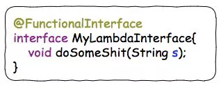 这种只有一个接口函数需要被实现的接口类型,我们叫它”函数式接口“。为了避免后来的人在这个接口中增加接口函数导致其有多个接口函数需要被实现,变成"非函数接口”,我们可以在这个上面加上一个声明@FunctionalInterface, 这样别人就无法在里面添加新的接口函数了: