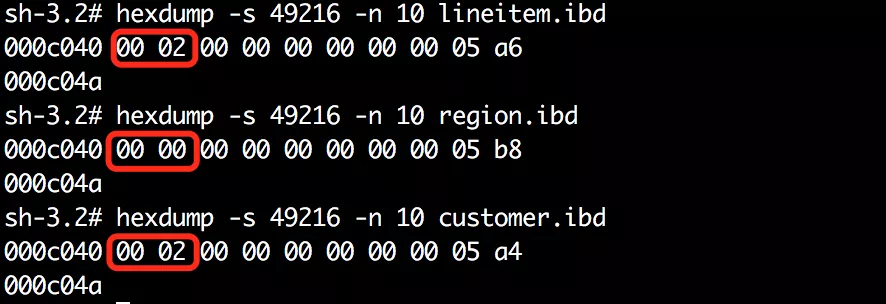 接下来我们用hexdump工具,查看表空间文件指定偏移量上的数据: