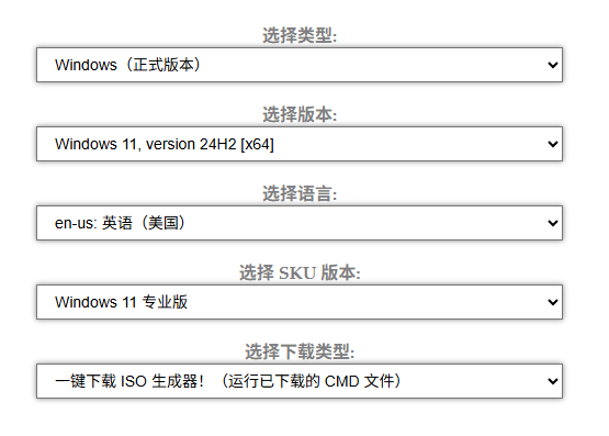 比如我这里选 的 24H2 的专业版。选好后,在右边会生成一个CMD文件。点击下载。然后用管理员权限运行一下。