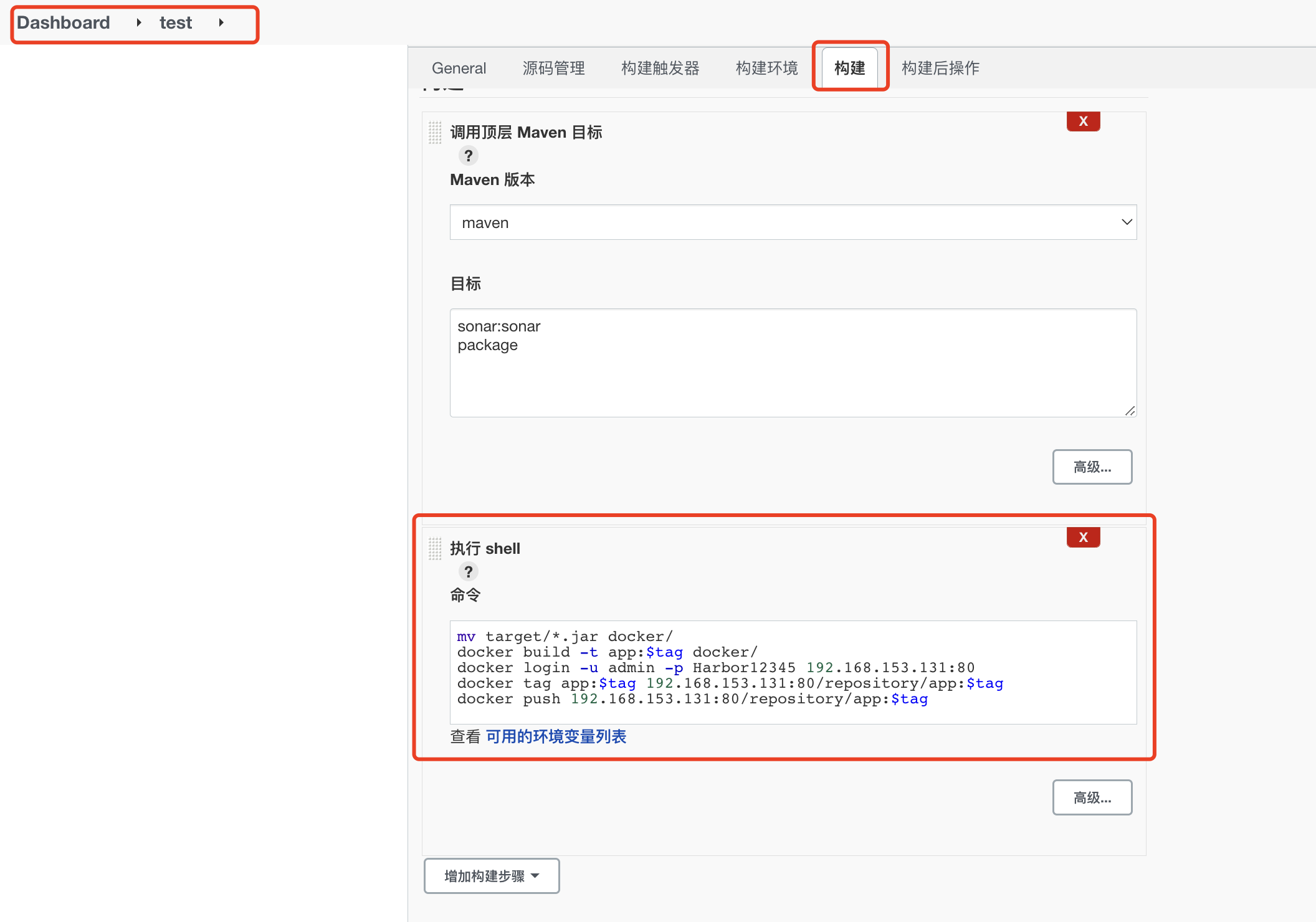 在Jenkins项目中的设置,构建步骤,添加执行shell,加入以下脚本。