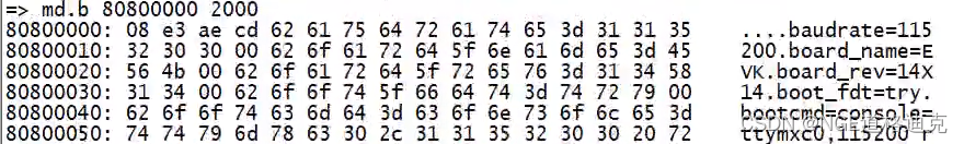 => md.b 80000000 14 //16进制,10进制是20,b表示8位--一个字节