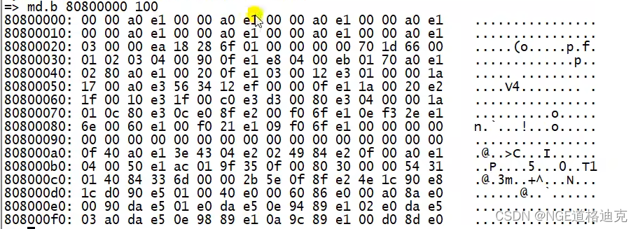 => md.l 80000000 10 //16进制,10进制是16,l表示32位--四个字节,一共64位