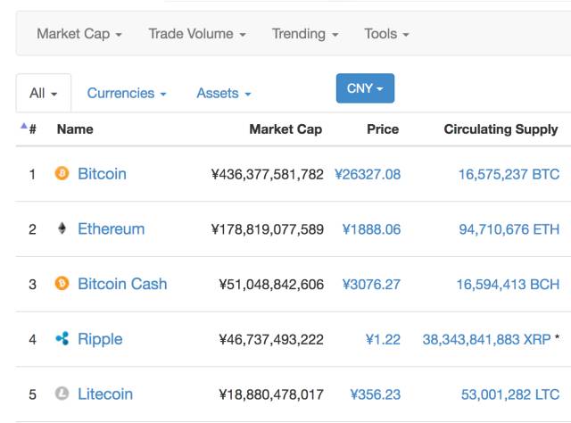 来自 https://coinmarketcap.com/#CNY 2017-09-19
