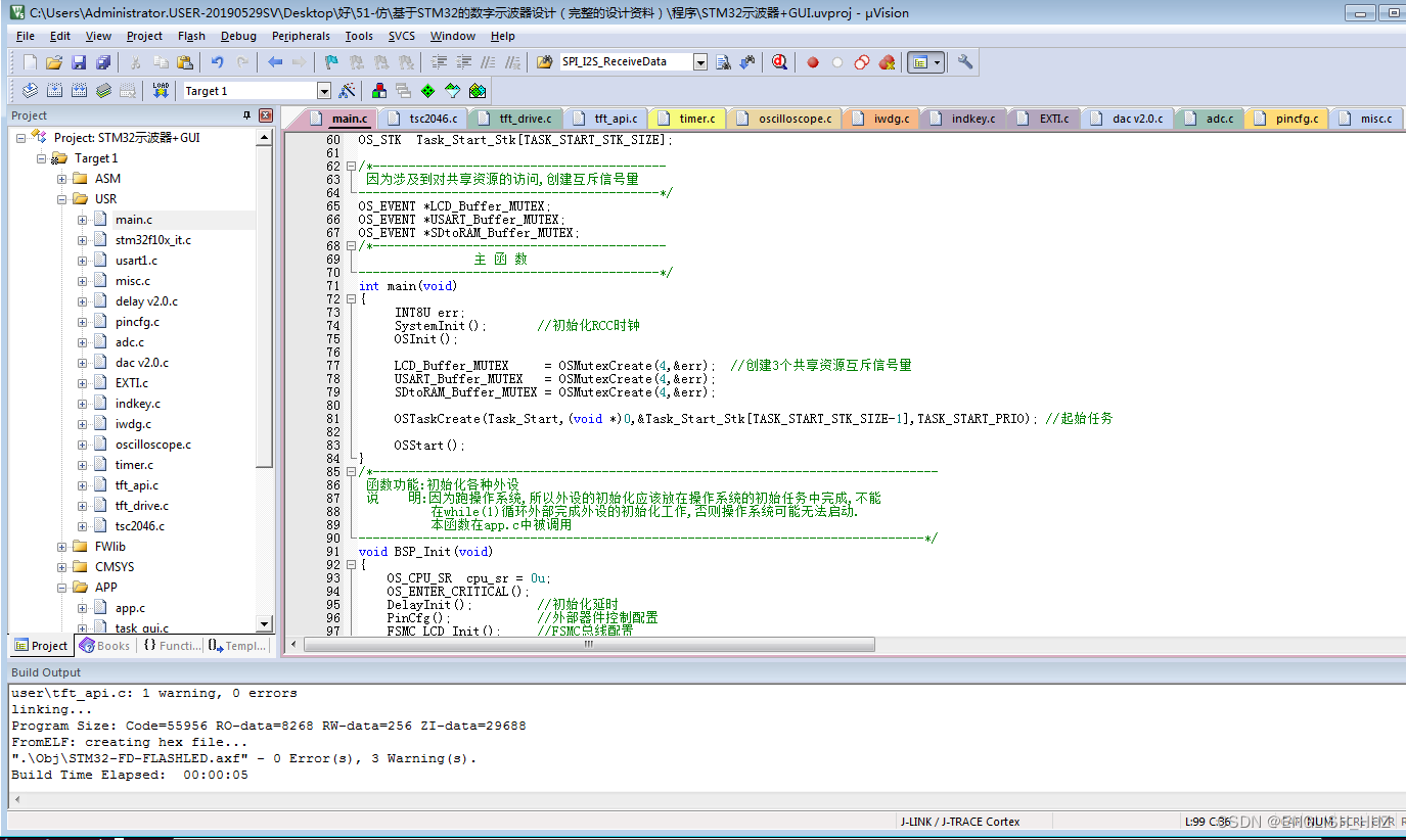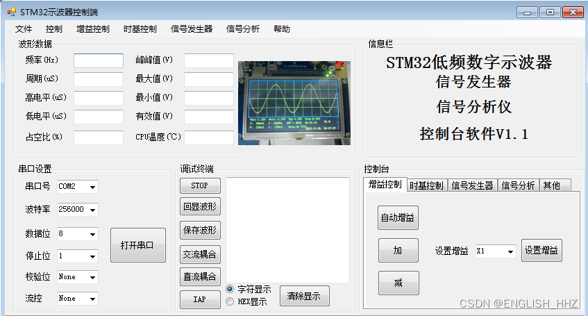 3、数据传输:用C#编写PC机上位机,通过串口完成对下位机的控制。(1)实现STOP/RUN功能(2)输出波形电压、时间参数(3)控制截屏(4)控制波形发生器(5)控制完成FFT(6)波形的存储和显示
