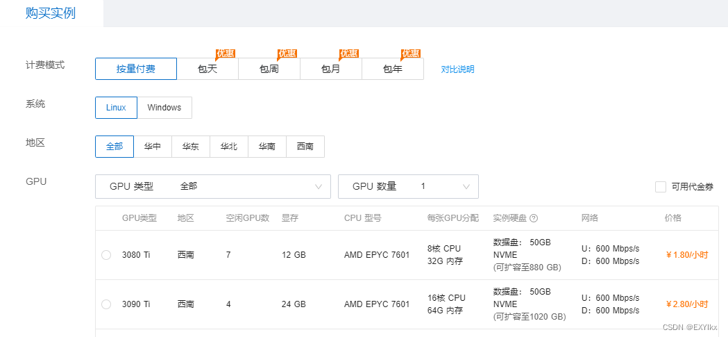 接下来选择想租什么配置的设备,操作系统建议会linux的就linux,实在不会才windows(后面的操作步骤是linux的命令),计费模式建议按量付费,也就是按小时付费