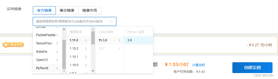 然后如图选择预装的python环境(尽量和yolo的版本匹配)最后点击创建实例。