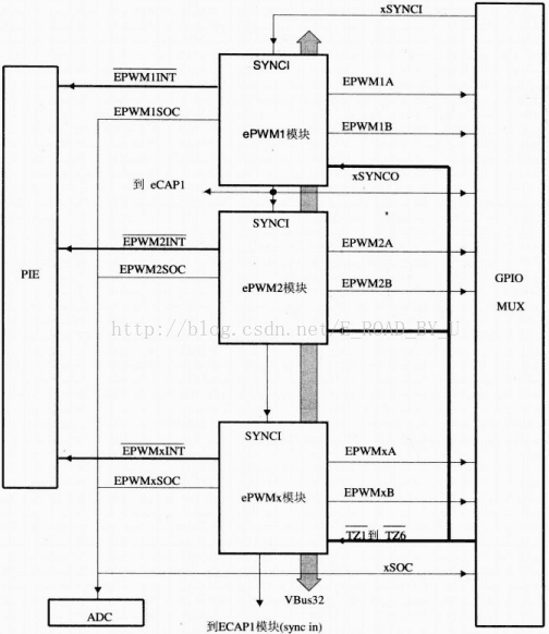28335有多个epwm模块,每个epwm模块可以产生2个波。这是28335的epwm模块的结构图及外部连接图。