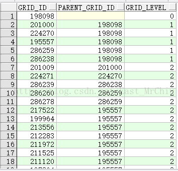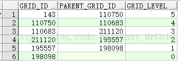 这个举个例子,有一张地域网格表,表中有网格ID和其父网格ID,按照给定的一个节点,可以按照层级遍历得到其所有父节点或者子节点。