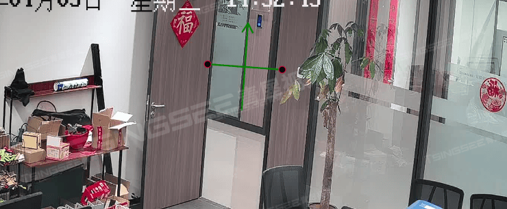 首先【客流统计】算法的识别需要满足两个条件:第一是人员流动的方向,我们可以看到一个箭头,该箭头就是控制方向的,顺箭头为正方向,逆箭头为反方向;第二是横着的线段,这个线段表示当人员的头部一半越过了这条线,那么就触发算法,按照运行的方向累加进出的数值。