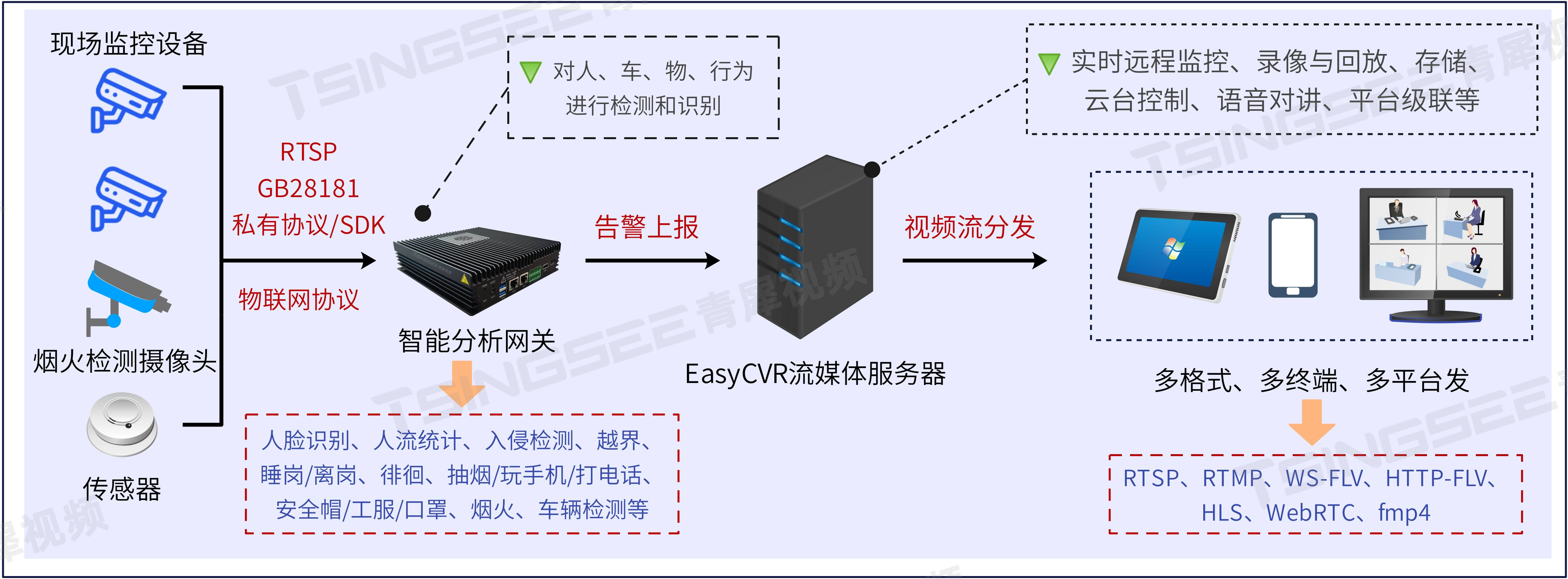 AI智能分析网关V4内置了近40种AI算法模型,支持对接入的视频图像进行人、车、物、行为、烟火等实时检测分析,上报识别结果,并能进行语音告警播放。硬件支持RTSP、GB28181协议、以及厂家私有协议接入,可兼容市面上常见的厂家品牌设备,可兼容IPC、网络音柱等。同时也支持智能摄像头的接入,对于已部署有AI算法的智能摄像头,平台也能展示摄像头上传的告警信息。