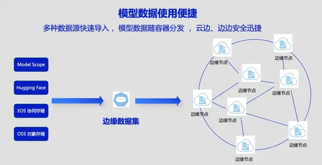 通常一个 AI 推理应用,它是需要一个模型文件的,这个模型文件有不同大小,需要在推理应用的进程中读取模型。可以说,模型文件是 AI 推理应用必不可少的部分。针对这一特点,我们设计了边缘数据集分发功能。提前传到我们的边缘协同存储 EOS 或者是中心对象存储 OSS 上的模型,可以通过简单的来源配置,制作成我们定义的边缘数据集。它可以随你的容器分发到不同的边缘节点,依托阿里云边缘云团队长期技术积累和资源优势,让数据集可以做到高效、安全、迅速的分发。通过边缘数据集分发能力,AI 推理应用的开发者,可以便捷的在自己的程序中读取、使用模型和数据,更加专注于应用的开发,提升效率。
