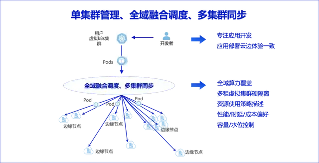 通过前面提到的多集群管理、融合调度、异构资源管理,我们为用户提供多租的虚拟 K8s 集群。在租户 K8s 这个层面上,他是多租并且是硬隔离的,不会因为其他用户的异常操作而影响到你。一般为了管理不同地域的资源,通常需要使用多个 K8s 集群,但是在我们这个架构下,开发者只需要关注一个租户集群,把自己的 Pod 创建在自己的租户集群中,我们的融合调度和多集群同步功能就会将 Pod 同步分发到众多的边缘节点。开发者不需要投入过多的精力去关注多集群管理,集群规划等细节,这些我们替他搞定。