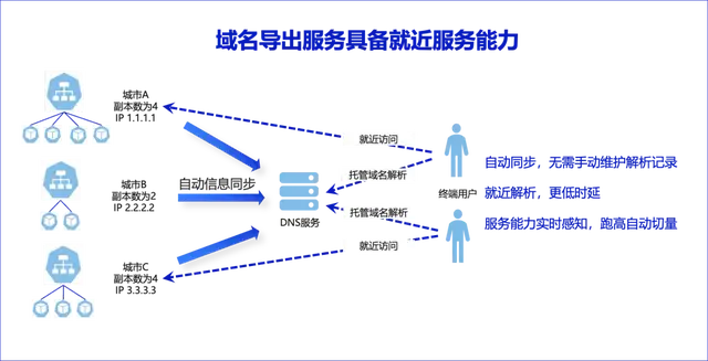 而现在,直接使用我们现在的域名服务导出能力,只要把域名权威托管或者 CNAME 解析过来,我们就可以联动部署去给你自动做就近解析。因为你是通过边缘容器云部署的,IP 有哪些,我们可以直接给你添加到边缘云的解析服务中;ip 的运营商属性是什么,我们可以直接给你添加到边缘云的解析服务中;IP 的能力是多少,能跑多少 QPS,我们可以基于后面的副本数转换,权重信息可以给到边缘云的解析服务中;服务的能力跑高了,负载均衡的监控数据我们也对接到边缘云的解析服务中,他可以自动做切量和水位控制。