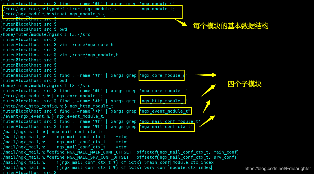 find . -name "*h" | xargs grep "ngx_module_s"可以找到ngx_module_t的定义.