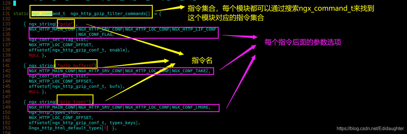 ngx_command_t *commands;//这里面每个元素都是指令及一些参数