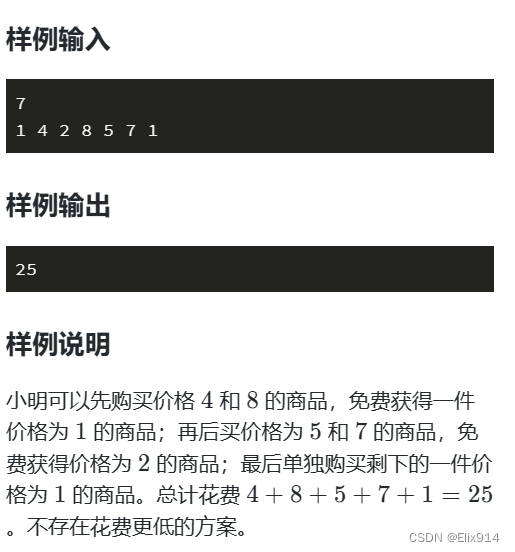 每购买 2 件商品,假设其中较便宜的价格是 P(如果两件商品价格一样,则 P 等于其中一件商品的价格),就可以从剩余商品中任选一件价格不超过 P/2的商品,免费获得这一件商品。可以通过反复购买 2 件商品来获得多件免费商品,但是每件商品只能被购买或免费获得一次。