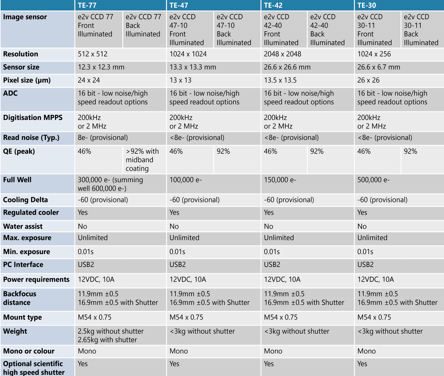 这些先进的成像解决方案配备了可选择的背照或前照式传感器,可选择全帧CCD或帧传输CCD,可选配45毫米双稳高速科研级别机械快门,开启时间为20.0毫秒。