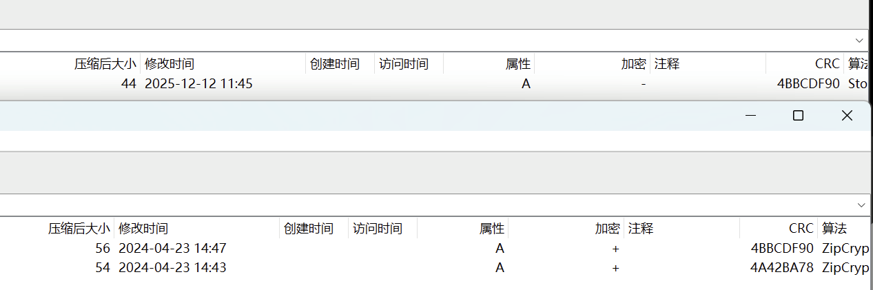 发现里面有两个txt文件,都很小但是需要密码,这里其实一开始回去翻流量找了半天,啥也没翻出来,爆也爆不出来,忽然想到前面解码出的的一句话,将他写进txt文件并压缩后,打开对比压缩包发现他与secret2的CRC值相同