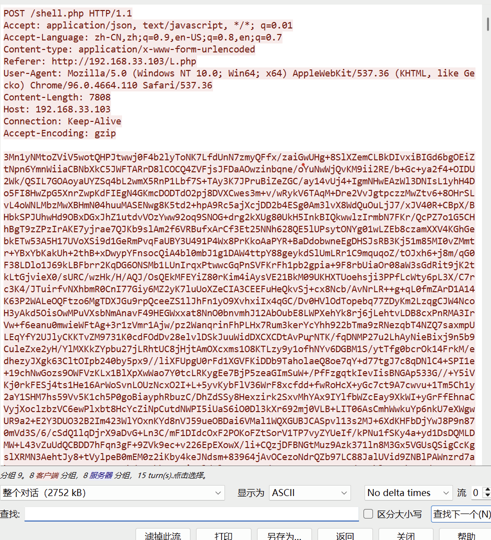 这是典型的webshell工具冰蝎的流量特征,放到CTF-NetA中进行webshell冰蝎流量解密,发现这么两个流量: