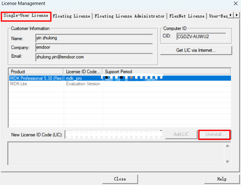 2)、将邮件的列表中一台许可计算机进行卸载授权,首先进入uVsion IDE中打开“File”-“license Management”,进入 “Single-User license”目标栏,选中所需卸载授权,单击“Uninstall...”然后在提示符中选择“Yes”。